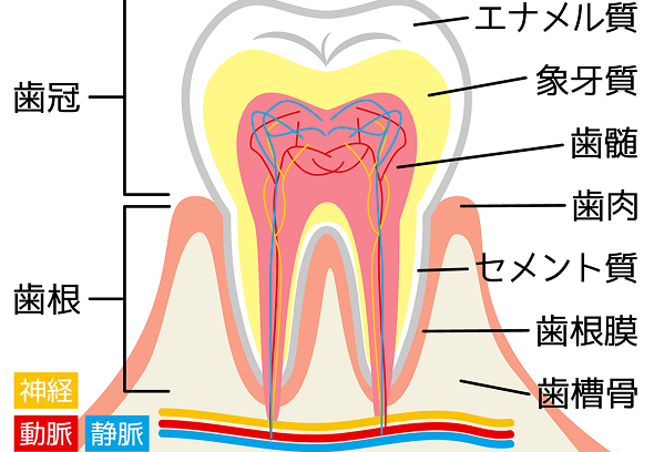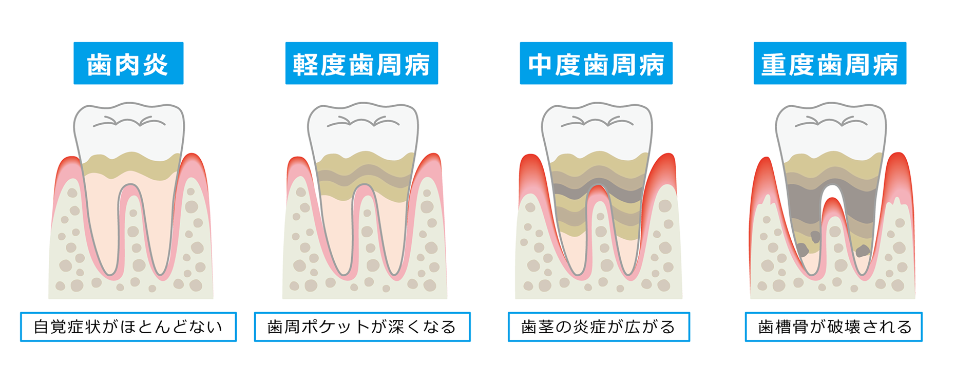 歯周病は、磨き残しによって歯茎の炎症から始まります。そして進行していくことで歯周ポケットが深くなり、歯を支えている骨が溶けて失われていきます。初期の段階では症状が軽度で発見しにくい特徴がありますが、進行すると骨がなくなってしまうため、歯がぐらぐらと動揺し、最終的には歯を失ってしまう原因となります。歯周病の対策としては、早期発見と適切な治療が進行を防ぐためにとても重要です。