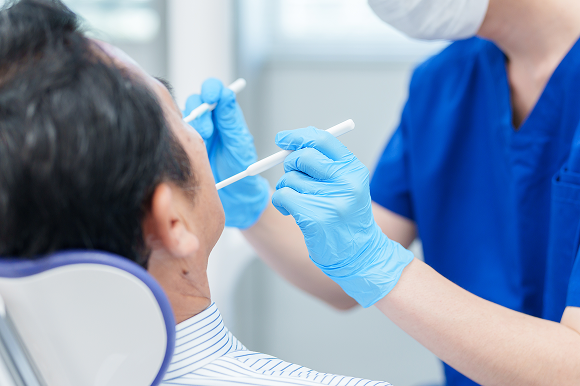 歯周病は、口腔内に存在する歯周病菌によって歯を支える骨が溶かされてしまう感染症の一つで、成人の90%以上に認められるものといわれています。歯周病菌は、主に歯に付着した歯垢や歯石、深い歯周ポケット内に存在しており、初期症状としては歯茎の腫れや出血、口臭などです。歯周病は自覚症状が比較的少ないため、気づきにくく、自覚したときには歯を失ってしまう大きな要因にもなります。そのため、早期発見と早期治療、予防ケアが特に重要です。